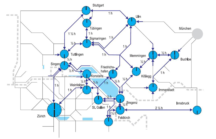BODAN-RAIL 2020 ist zuerst und vor allem ein Angebotskonzept. Es verknüpft die Taktsysteme der deutschen, österreichischen und schweizerischen Bahnen so miteinander, dass auch an den Grenzen ein durchgängiges System entsteht.