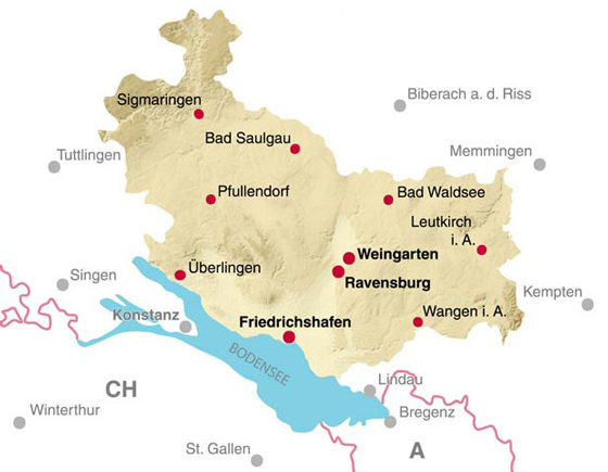 Das Verbandsgebiet befindet sich im Regierungsbezirk Tübingen und umfasst die drei Landkreise Bodenseekreis, Ravensburg und Sigmaringen. Die 87 Städte und Gemeinden sind neun Mittelbereichen zugeordnet. Die drei Städte Friedrichshafen, Ravensburg und Weingarten bilden das gemeinsame Oberzentrum der Region.